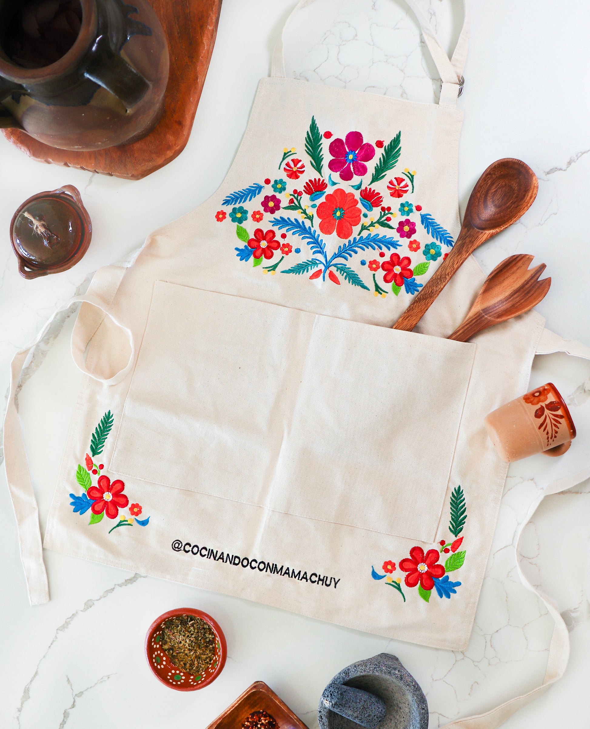 This embroidered apron is a beautifully crafted piece featuring colorful traditional patterns and vibrant stitching. It showcases the artistry and cultural heritage of Mexico, making it a unique and eye-catching accessory.