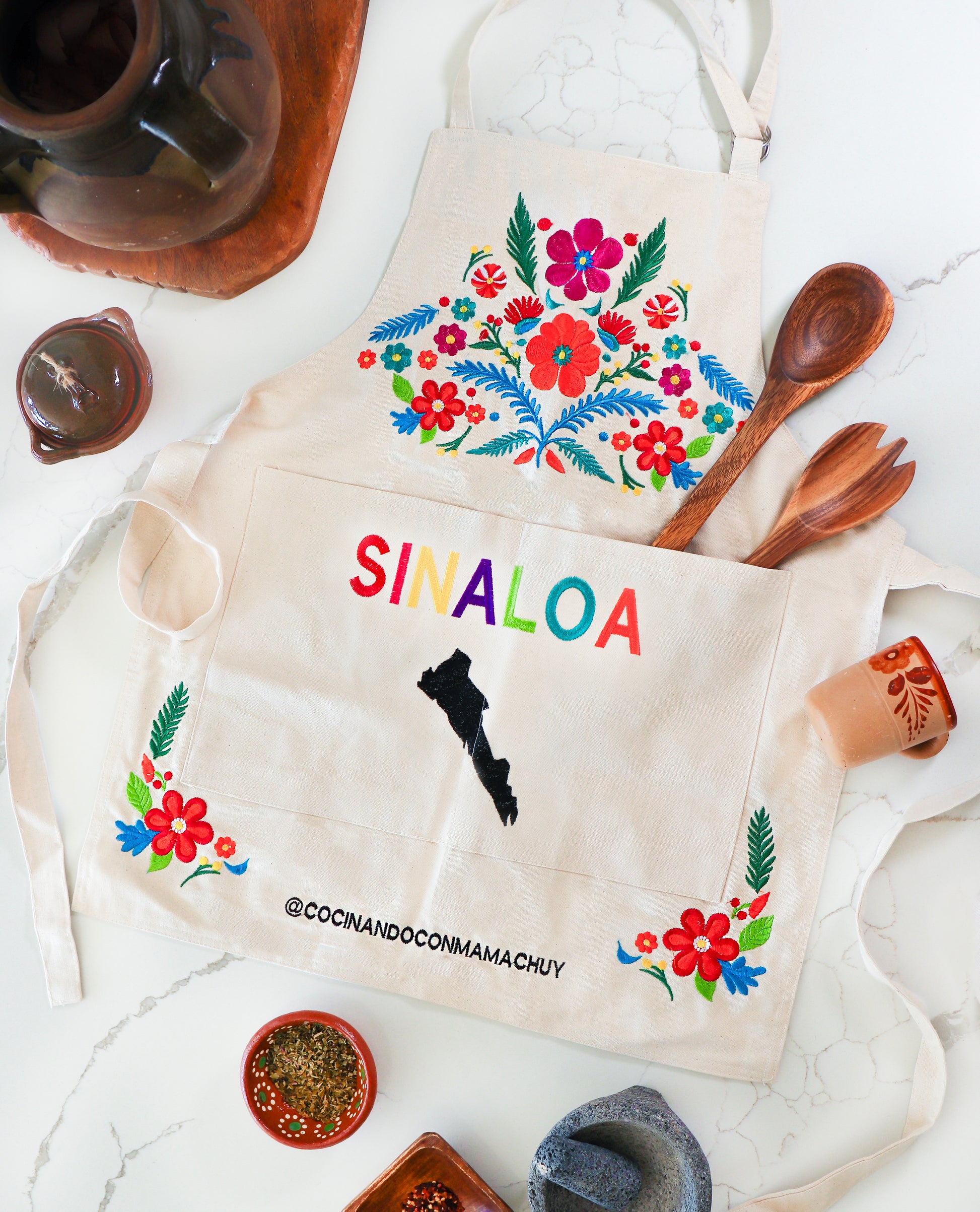 This embroidered apron is a beautifully crafted piece featuring colorful traditional patterns and vibrant stitching. It showcases the artistry and cultural heritage of Mexico, making it a unique and eye-catching accessory.